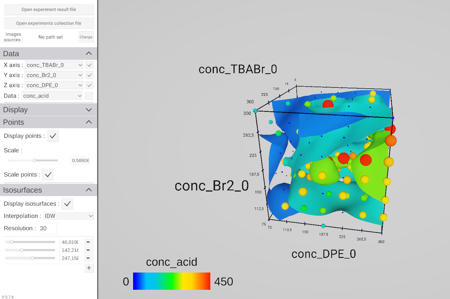 This first version display entries as points in a 3D space. 3 properties are used as the X/Y/Z coordinates while a 4th property is used as a scalar and displayed as points color and size.